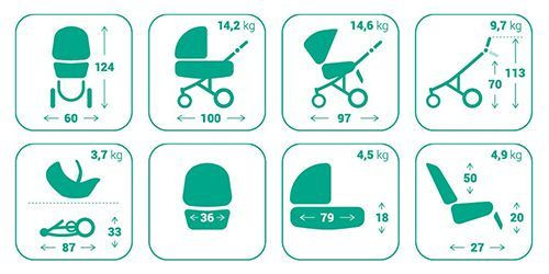 Kiegészítők: Lábzsákok (a mózesen, a hordozón és sportrészen is), pelenkázó táska, esővédő, szúnyogháló, cumisüvegtartó  + Ajándék felhelyezhető fényvisszaverő csík, kerékvédő huzatok