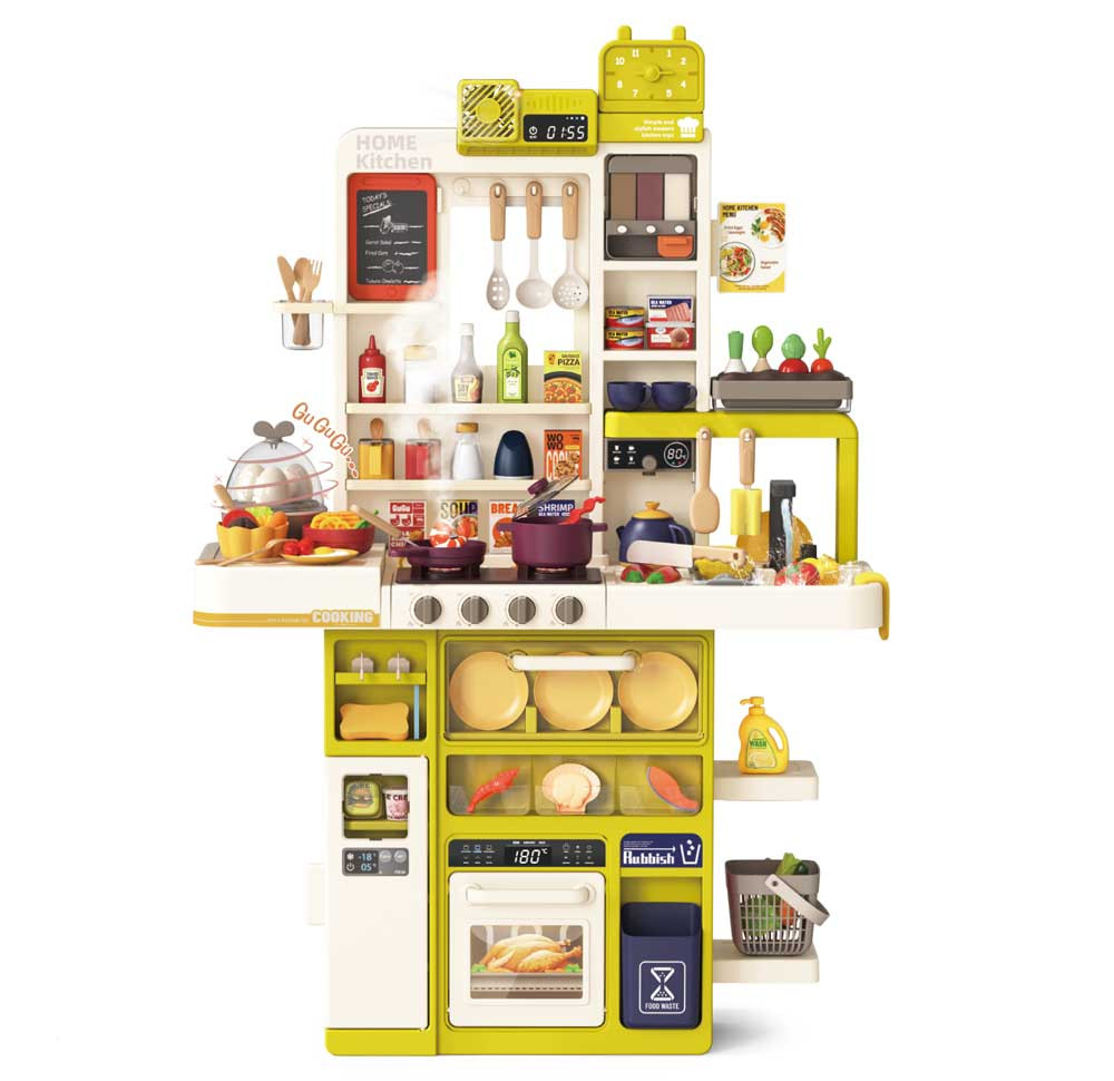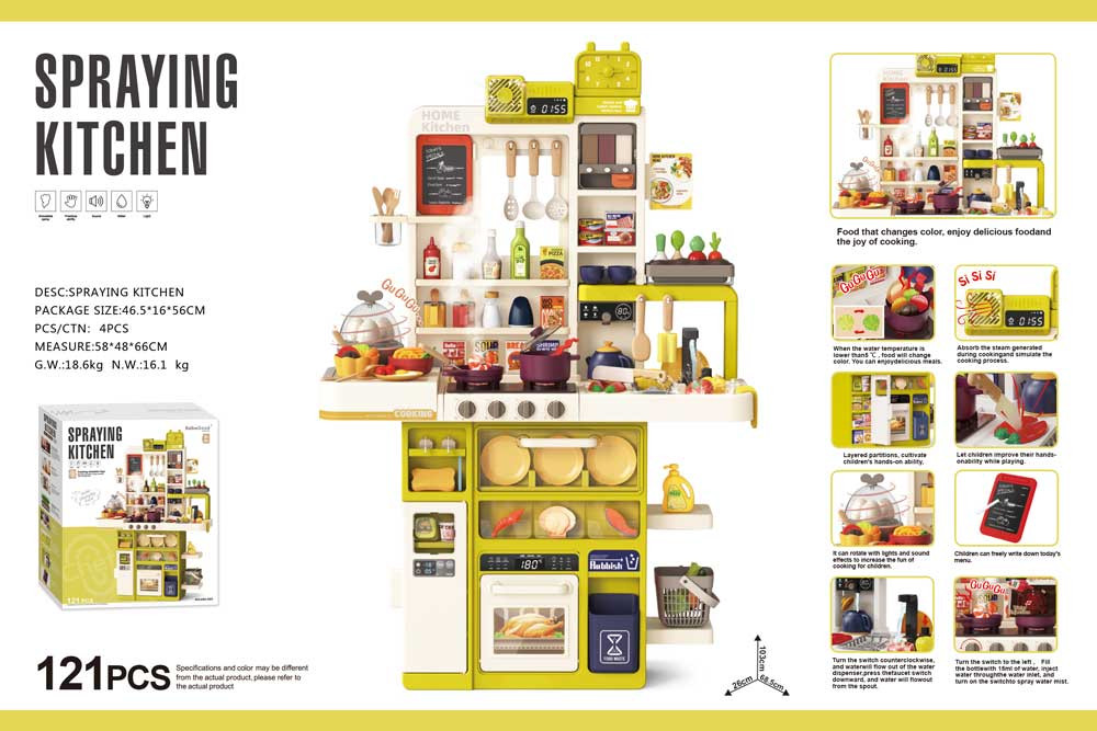Okrem kuchynky obsahuje balenie 121 doplnkov: panvice, taniere, naberačky, kúsky ovocia a zeleniny a kompletný úložný systém (police, košíky, háčiky).